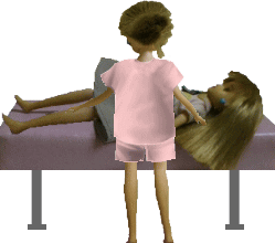 脳梗塞などで半身麻痺になった患者さんなら、患側だけ行います。うちの母は「レビー小体型認知症」だったので両側の訓練をしました。ベッドの端に寝かせて、手前側は立位で行い、反対側はベッドに坐ってやりました。 |