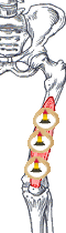 ② 鼠径部の痛みを伴います。深部にある股関節に向けて、筋肉の通り道を狙います。大腿直筋と合わせて深い鍼を打ちます。 |