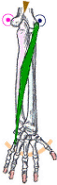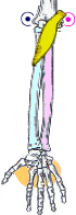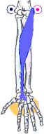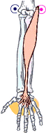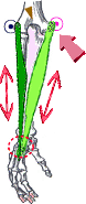 肘の外果からの尺側手根伸筋(■)と、内果からの尺側手根屈筋(■)が尺骨をはさんで、手首の小指側(○)に裏表でくっつき、共同で「尺屈=手首を小指側に曲げる」運動をしています。