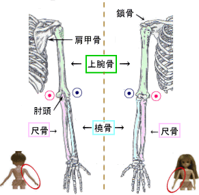 | 上腕骨の上端は肩甲骨につながって肩関節を形成しています。下端は前腕の尺骨の肘頭と関節していて、尺骨の横には橈骨がくっついています。 |