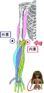 「上腕骨内側上顆」=内果 は肘の内側のでっぱりです。前腕にある強力な屈筋がここにくっついています。