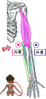 裏側には上腕の伸筋、上腕三頭筋がくっついています。 |