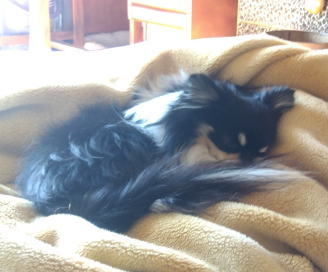「あら~、ティラちゃん、分かるの~?」と、ティラにもおすそ分けしたあと、「抱っこしたいわ~」と言うので、お腹の上にのせてあげた。