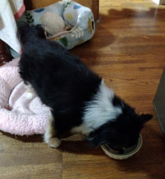 | お皿にパンのかけらを入れてあげると、いそいそと食べる。 |