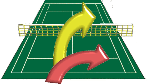 (ラケットを振る方向が⇒で、ボールの飛ぶ方向が⇒である)