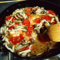 | 弱火ではじめて、バージンオイルに具材のエキスを溶かし込み、出来上がったソースをパスタにからめる・・・のがコツ。 |