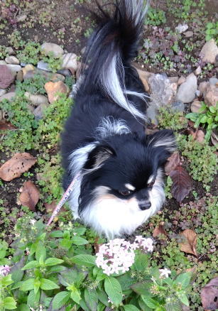 この日は郵便局に行く用事があったので、1時間半もの長い散歩になった。草取りの間もまわりをウロウロ。お日さまをたっぷりと浴びて、幸せいっぱいだったんだよ。 |