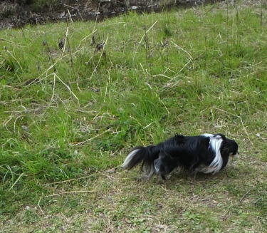 お散歩中にときどき立ち止まって、後ろ足でシャッシャッ!と交互に地面を蹴る。葉っぱや枝や土が、ビュッビュッと後に飛んでいく。