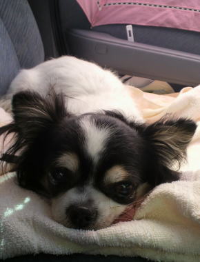 助手席にクーラーの冷気が行くようにしてはあるんだけど、直射日光でガンガン暑い。長い舌をダラ~ンとたらして、ハアハアしているのを見ると、心臓に負担がかかるのではと気が気でない。