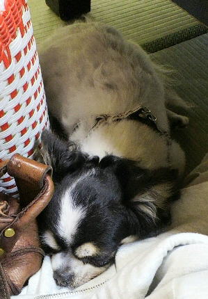 車の中では、助手席では私に抱っこされ、私が運転のときは、ドアとのすき間にすっぽりはまり込んで、私の太ももにあごをのせて、まったり。後部座席にいつものマットを用意しておいたんだけど、そこにのせると、心配気で落ち着かない様子だったからね~。